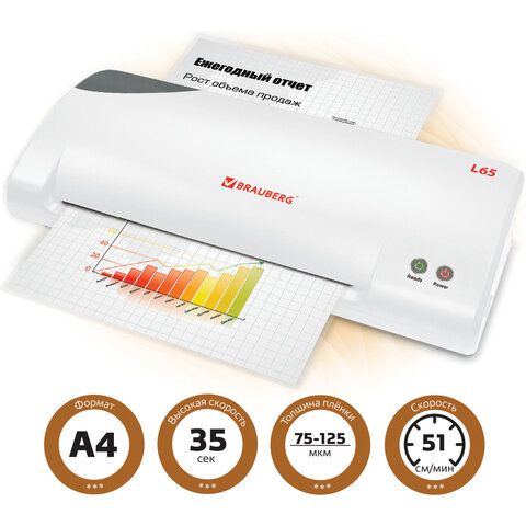 Ламинатор BRAUBERG L65, формат А4, толщина пленки 1 сторона 75-125 мкм, скорость 51 см/мин, 531352