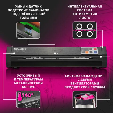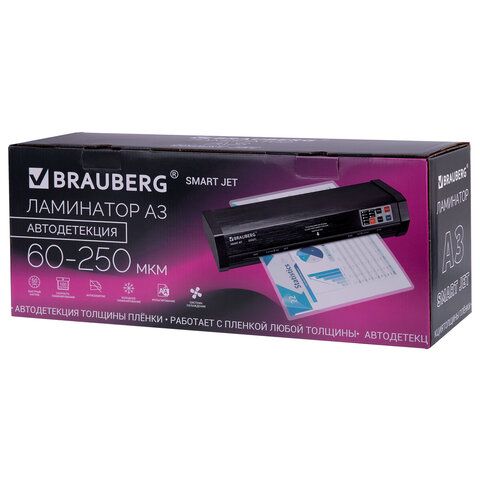 Умный ламинатор BRAUBERG SMART JET, формат А3, с функцией АВТОДЕТЕКЦИИ толщины пленки 60-250 мкм, быстрый нагрев 50 сек., 100 см/мин, 532271