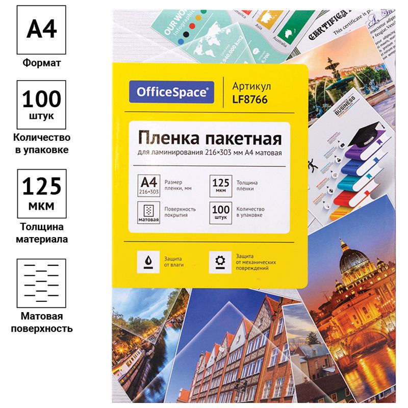 Плёнка для ламинирования OfficeSpace придает документу жесткость, обладает высокой прозрачностью после ламинации, защищает документ от механических повреждений и воздействия влаги.