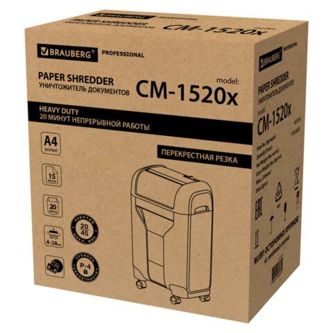 Уничтожитель (шредер) BRAUBERG PROFESSIONAL CM-1520x, "Heavy Duty", 4 уровень секретности, 4х28 мм, 15 листов, корзина 20 литров, 533130