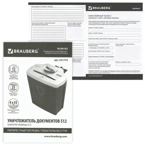 Уничтожитель (шредер) BRAUBERG S12, 4 уровень секретности, фрагменты 4х35 мм, 12 листов, 25 л, 531774
