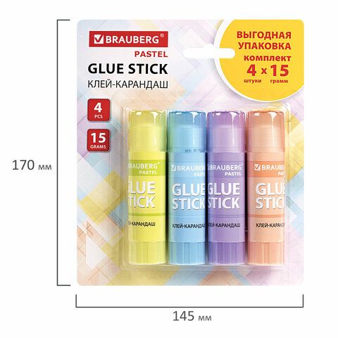 Клей-карандаш 15 г, ВЫГОДНАЯ УПАКОВКА, BRAUBERG PASTEL, 4 штуки на блистере, PVP-основа, 271250