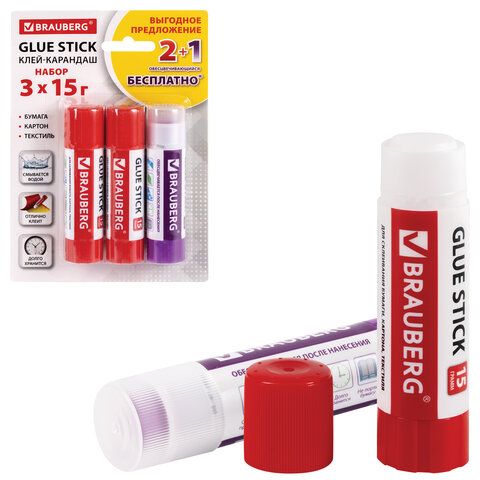 Клей-карандаш "2+1 обесцвечивающийся" BRAUBERG 15 г, 3 штуки на блистере, 229474