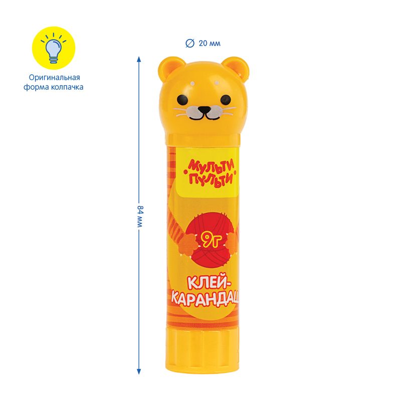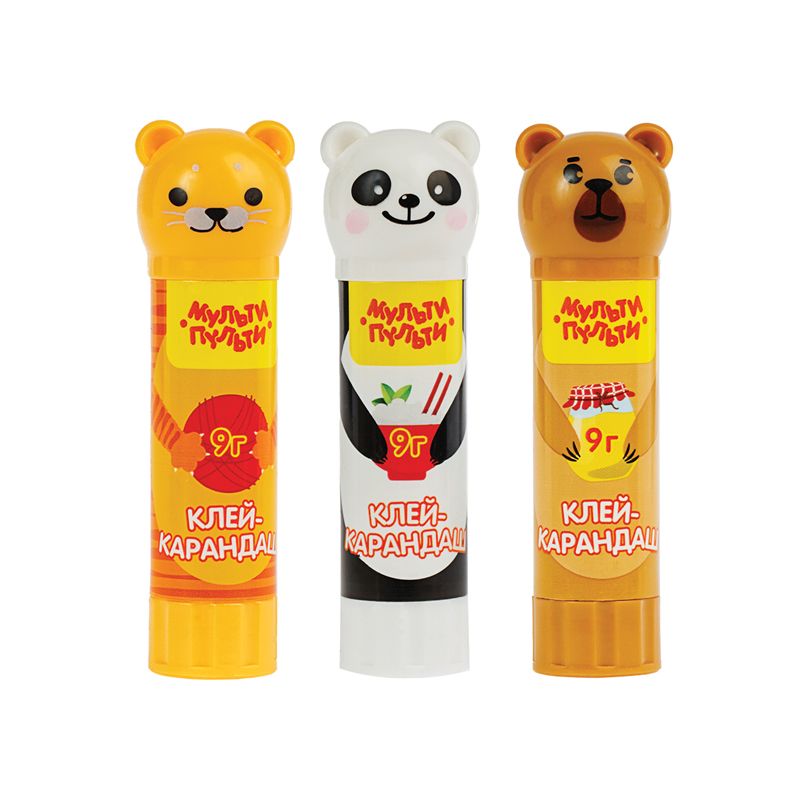 Клей-карандаш Мульти-Пульти "Зверята: Кот, Мишка, Панда", 09г, колпачок в форме животного, ПВП