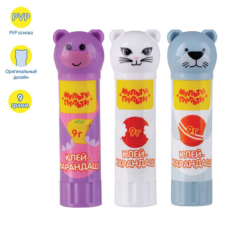 Клей-карандаш Мульти-Пульти "Зверята: Морской котик, Бегемот, Кошка ", 09г, колпачок в форме животного, ПВП
