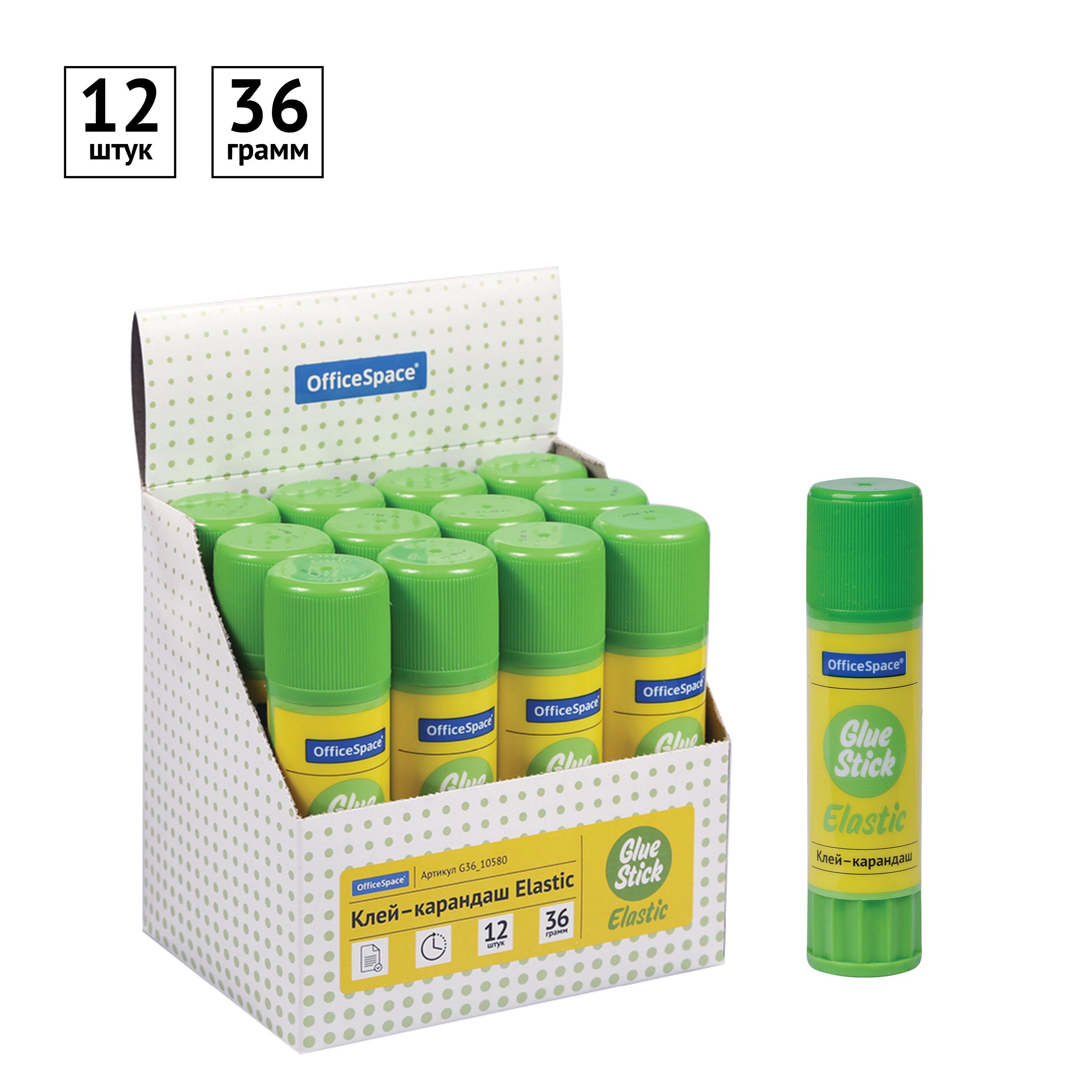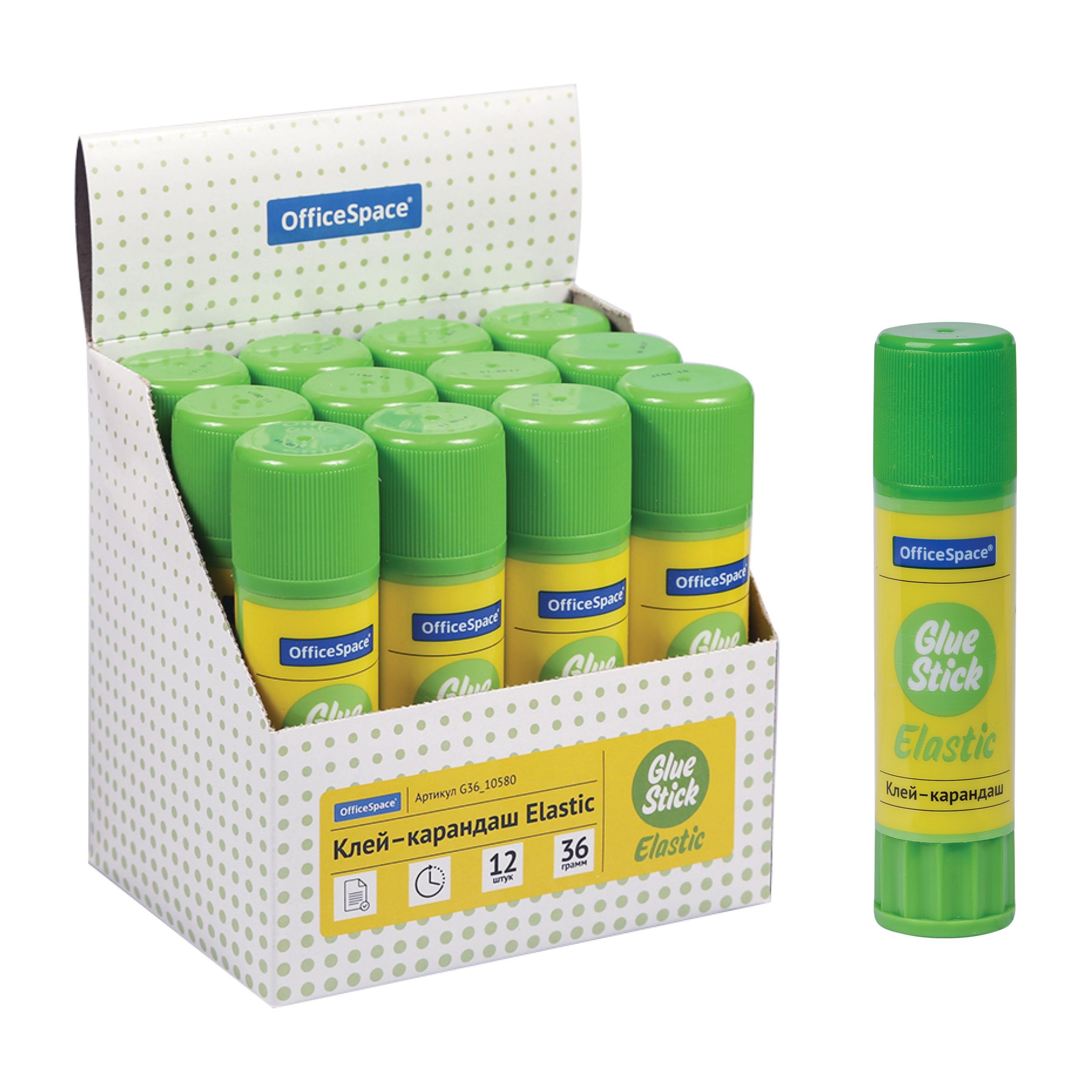 Клей-карандаш OfficeSpace "Elastic", 36г, улучшенный, дисплей, ПВП