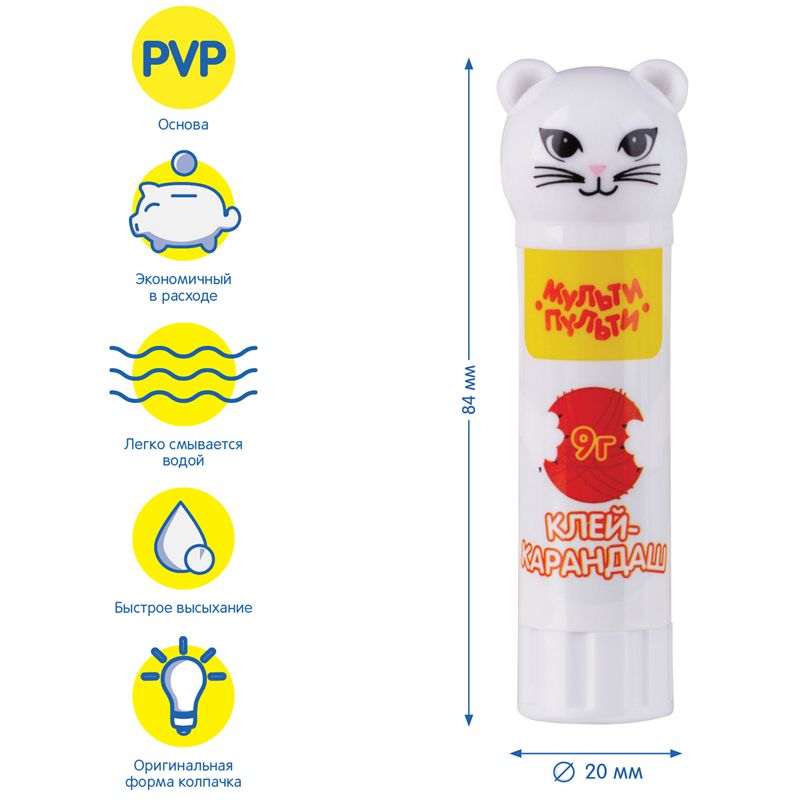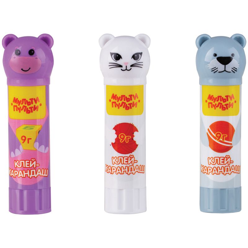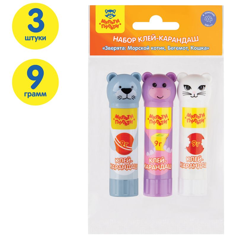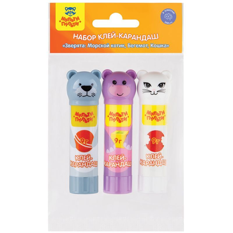 Набор клей-карандаш Мульти-Пульти "Зверята: Морской котик, Бегемот, Кошка ", 09г, колпачок в форме животного, ПВП, пакет, европодвес