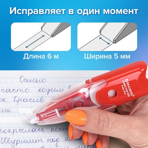 | Корректирующая лента | 4–6 мм*6–12 м | Сухая пленка | Не требуется | Точечные правки, тетради | 120 (Erich Krause, 5 мм*8 м) |