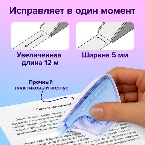 | Корректирующая лента | 4–6 мм*6–12 м | Сухая пленка | Не требуется | Точечные правки, тетради | 120 (Erich Krause, 5 мм*8 м) |