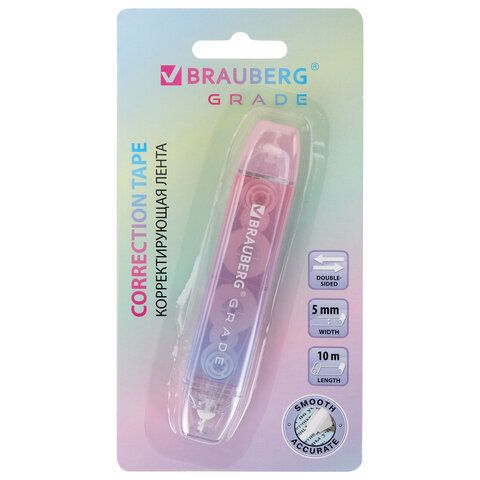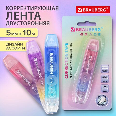 Корректирующая лента двусторонняя BRAUBERG "GRADE PASTEL", 5 мм x 10 м, корпус ассорти, блистер, 273025