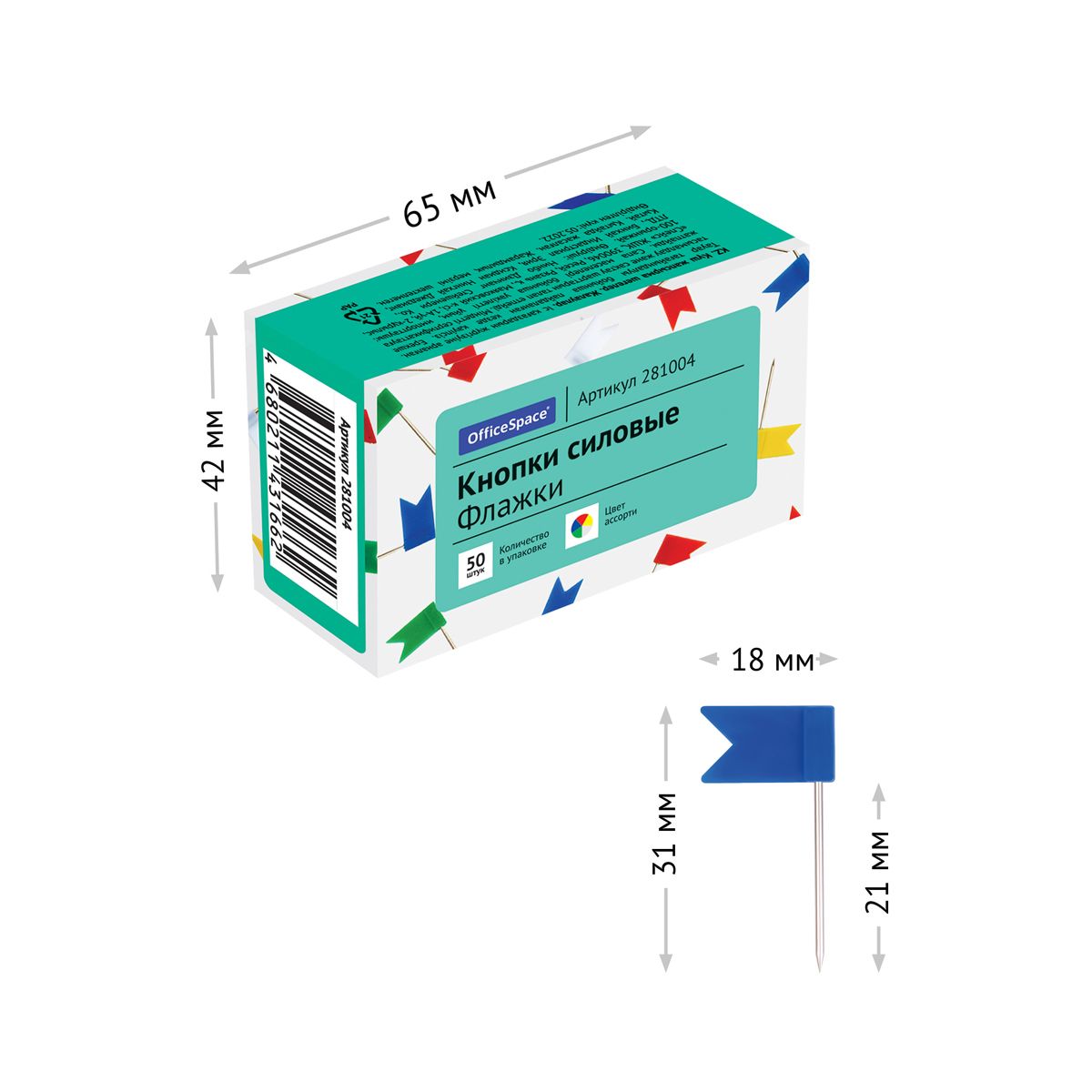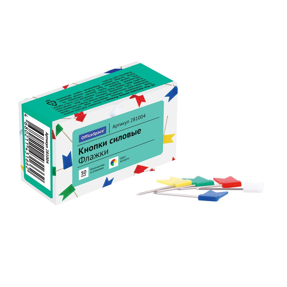 Кнопки силовые/флажки OfficeSpace, 50шт., ассорти, карт. упаковка