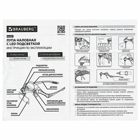 Лупа налобная с LED-ПОДСВЕТКОЙ, 5 сменных линз 95х33 мм, увеличение 1,0 - 3,5, BRAUBERG, 455929
