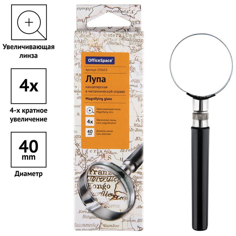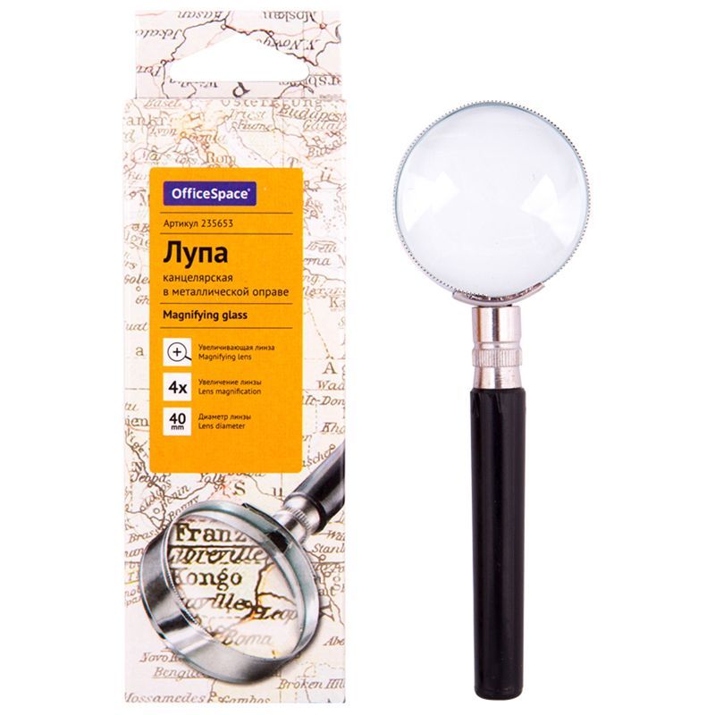 Лупа OfficeSpace, 40мм, 4-х кратное увеличение, в металлической оправе, карт. коробка, европодвес