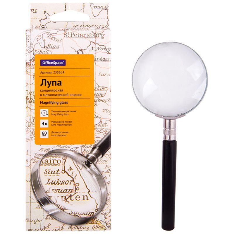 Лупа OfficeSpace, 60мм, 4-х кратное увеличение, в металлической оправе, карт. коробка, европодвес