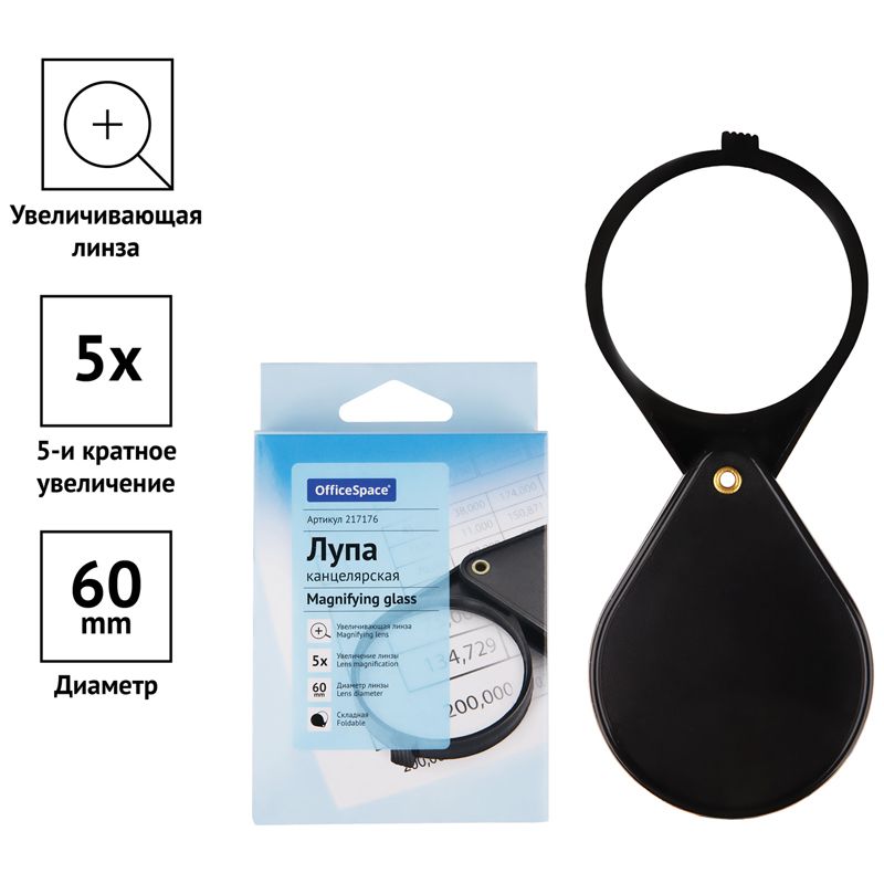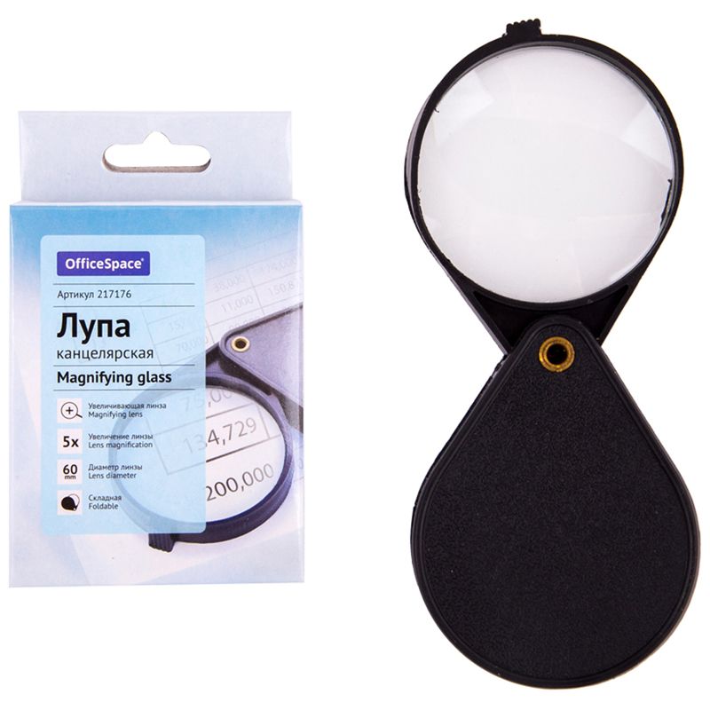 Лупа OfficeSpace, 60мм, 5-ти кратное увеличение, складная, карт. коробка, европодвес