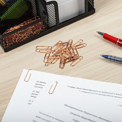 • Золотистые скрепки: с покрытием под золото, например, BRAUBERG EXTRA 28 мм (100 шт.).