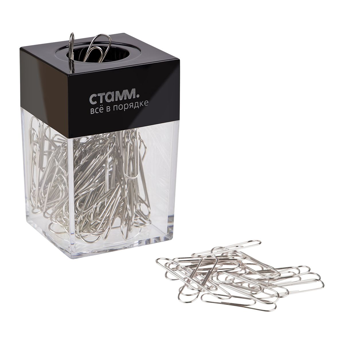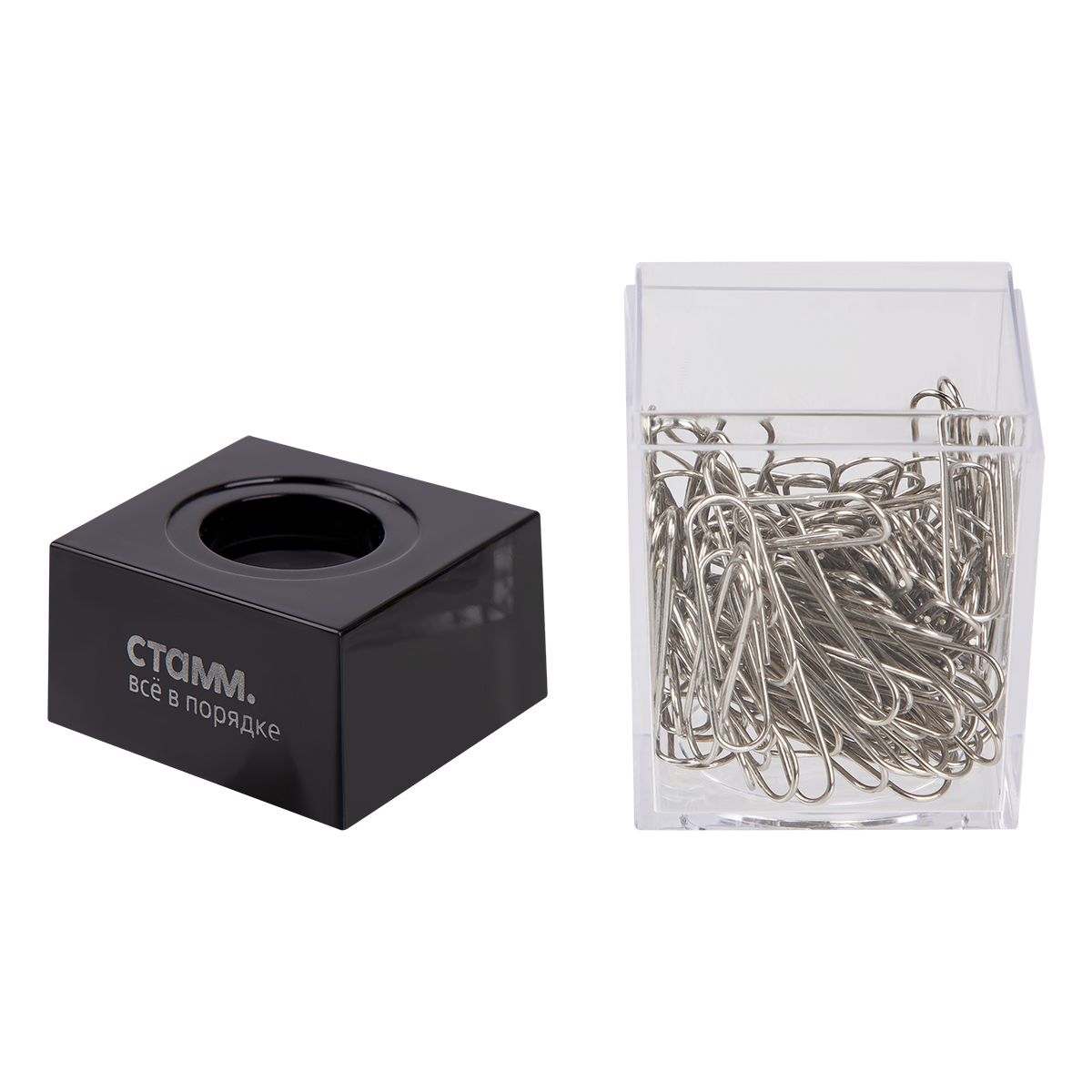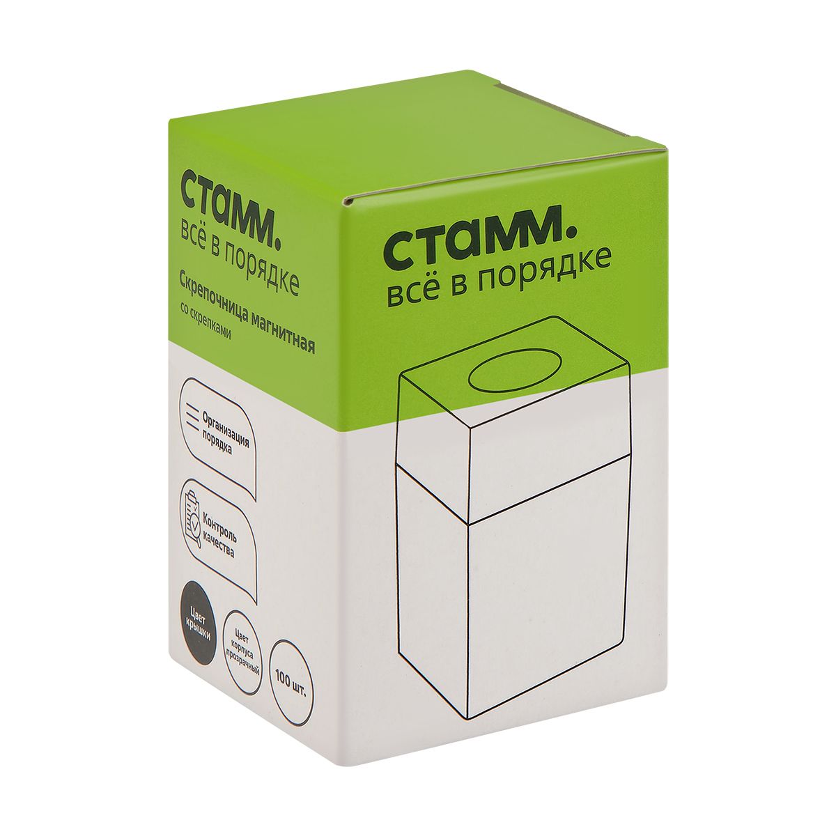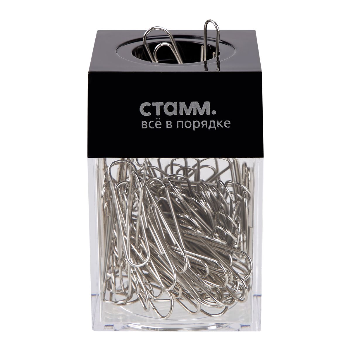 Скрепочница магнитная СТАММ, 100 никелированных скрепок, прозрачный корпус, картонная коробка
