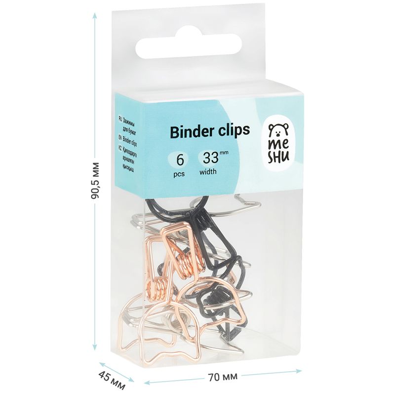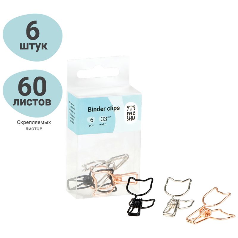Зажимы для бумаг 33мм, Meshu "Cute Cats", 6шт., ассорти, бокс с европодвесом