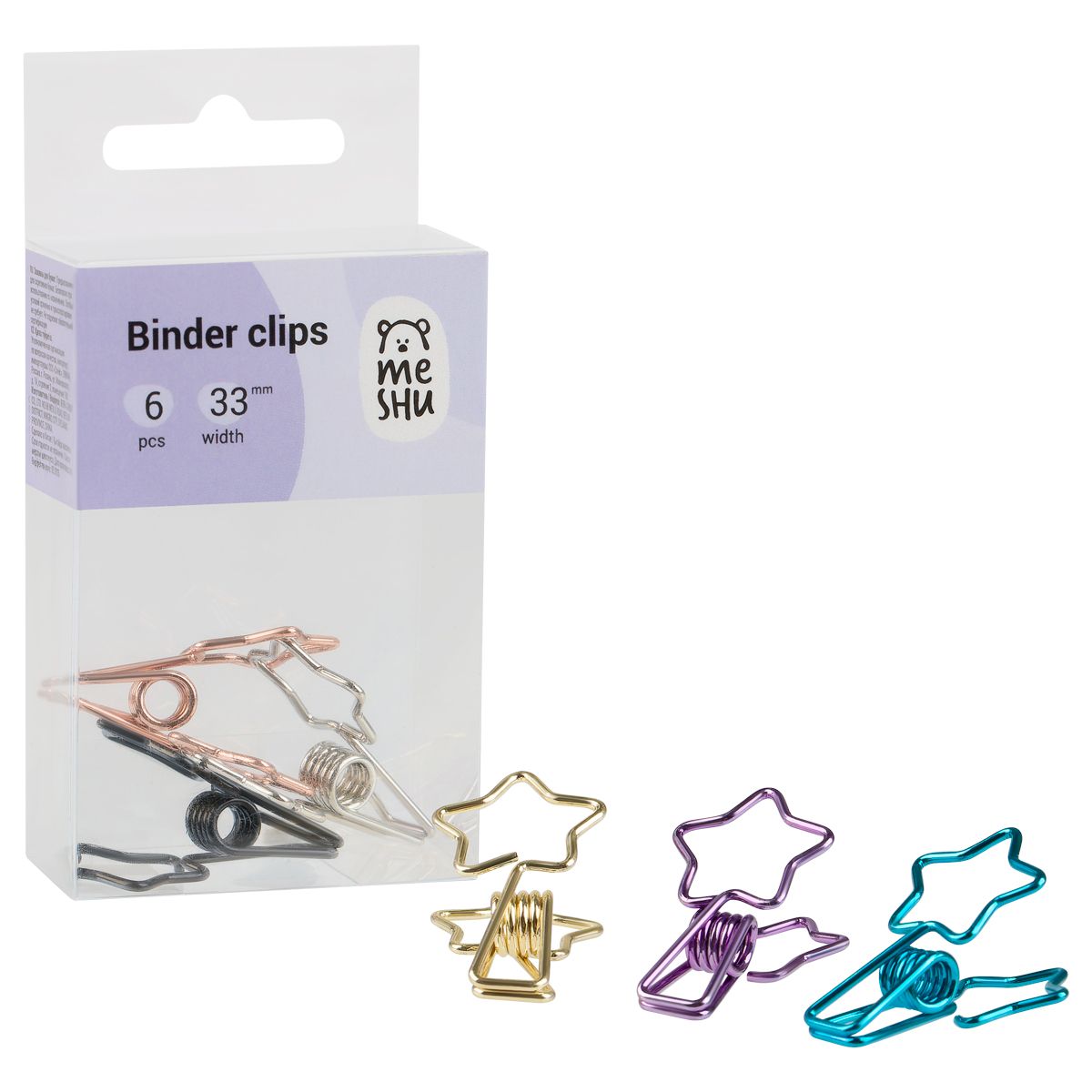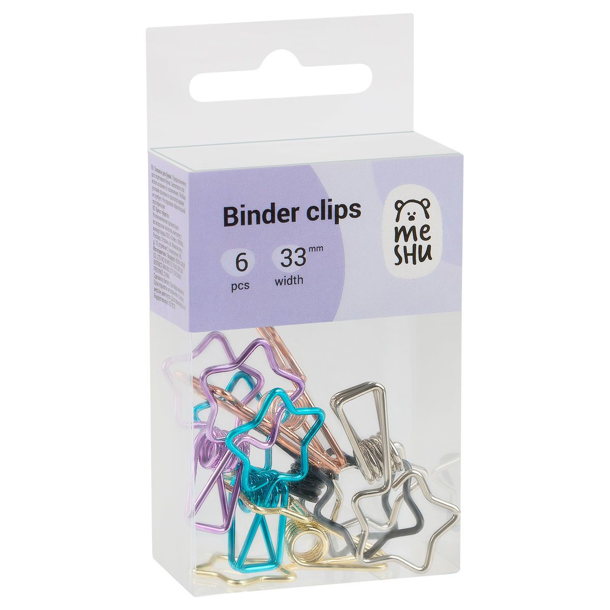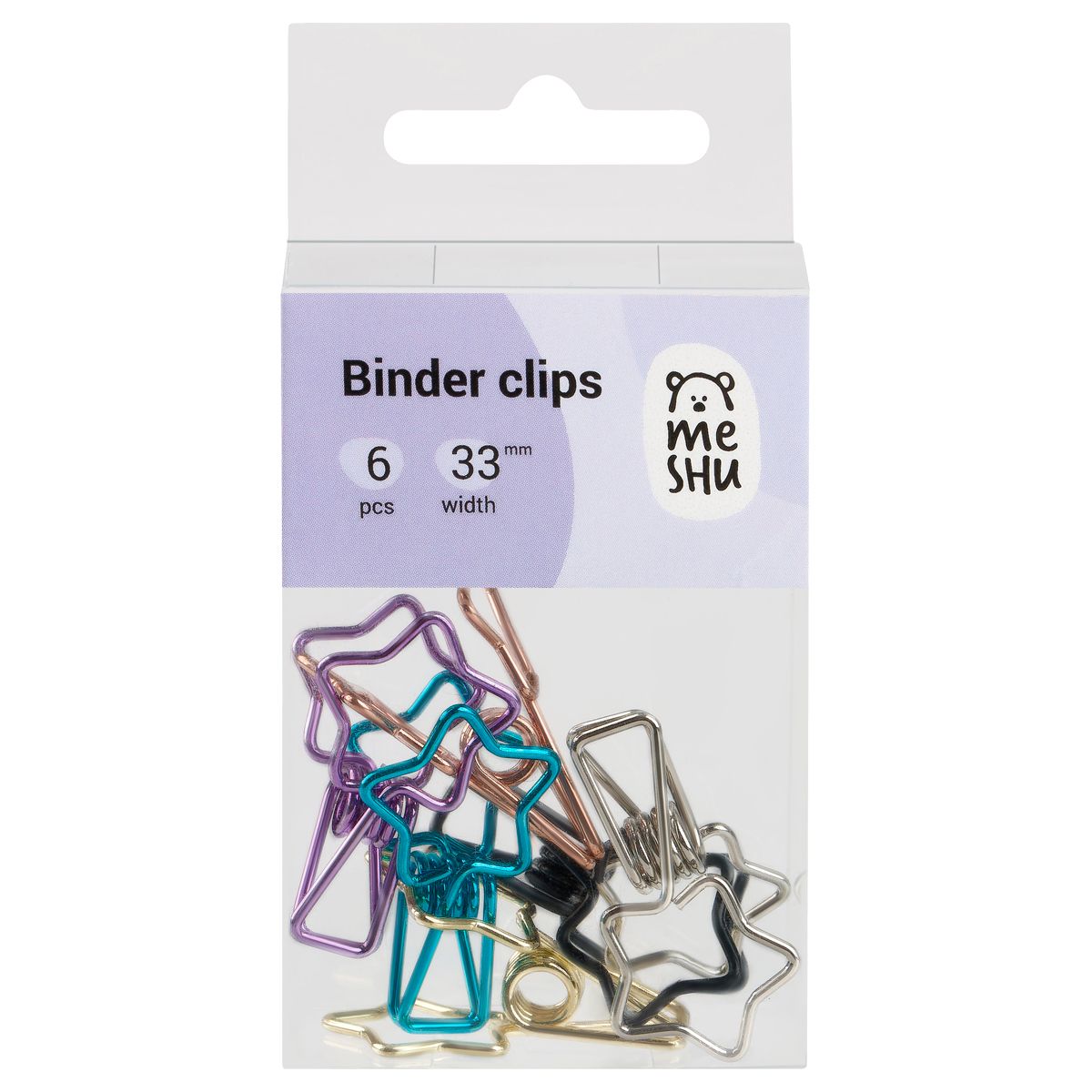 Зажимы для бумаг 33мм, MESHU "Shining Stars", 6шт., ассорти, бокс с европодвесом