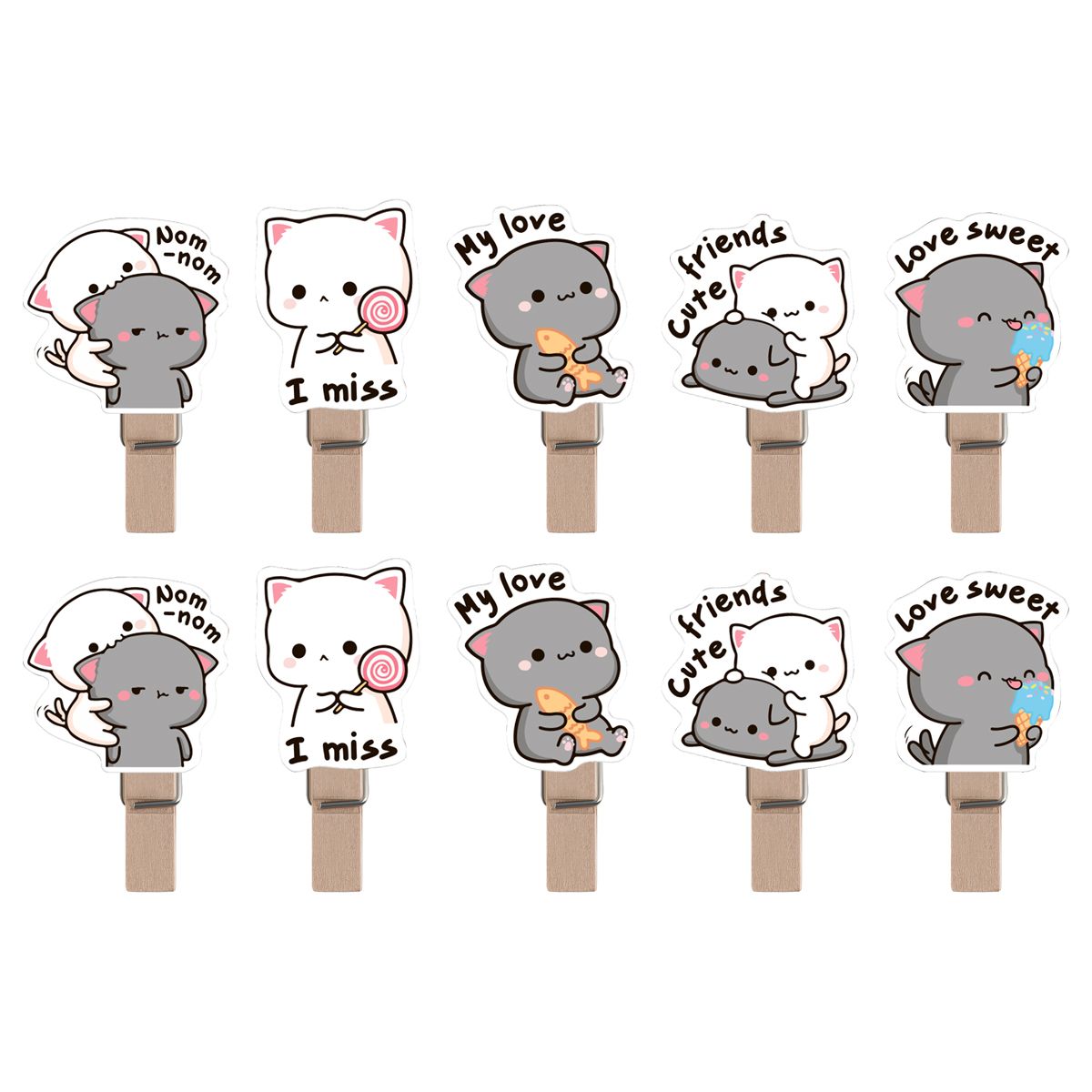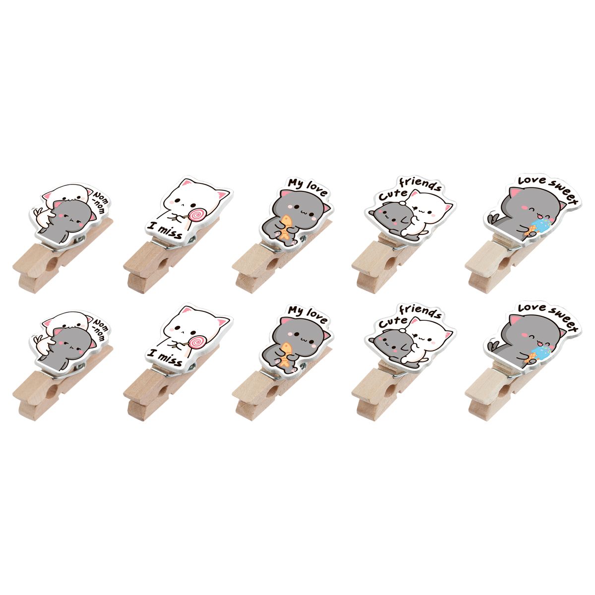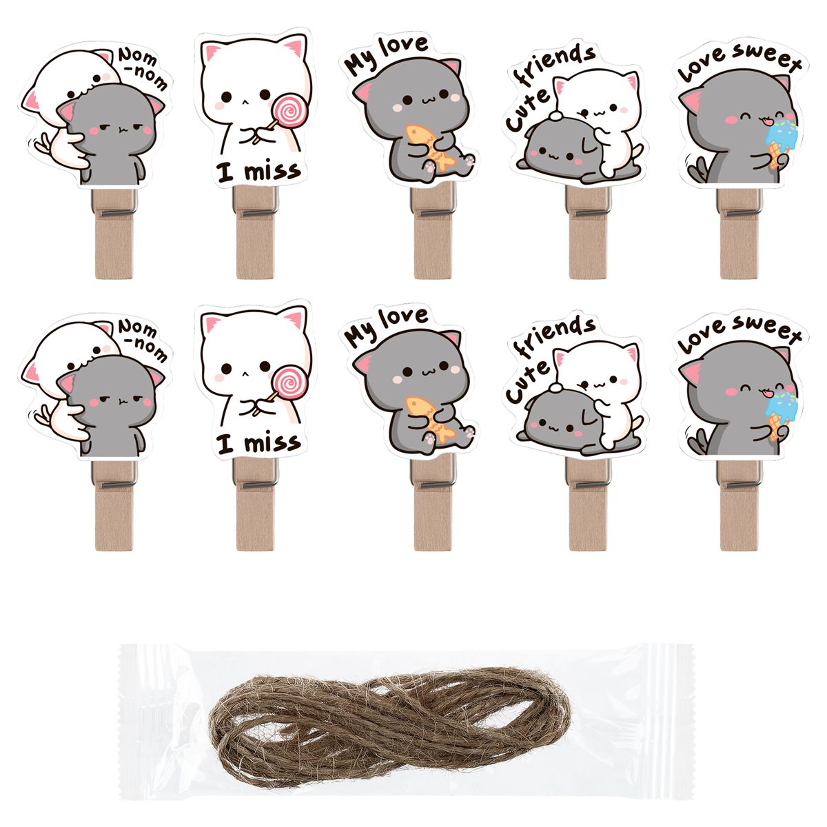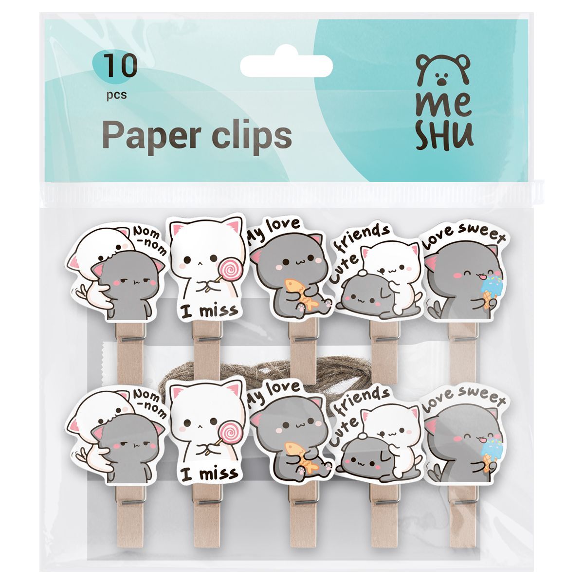 Зажимы для бумаг 7мм, MESHU "Best Friends" , 10шт., деревянные, ассорти, опп пакет с европодвесом, веревка в комплекте