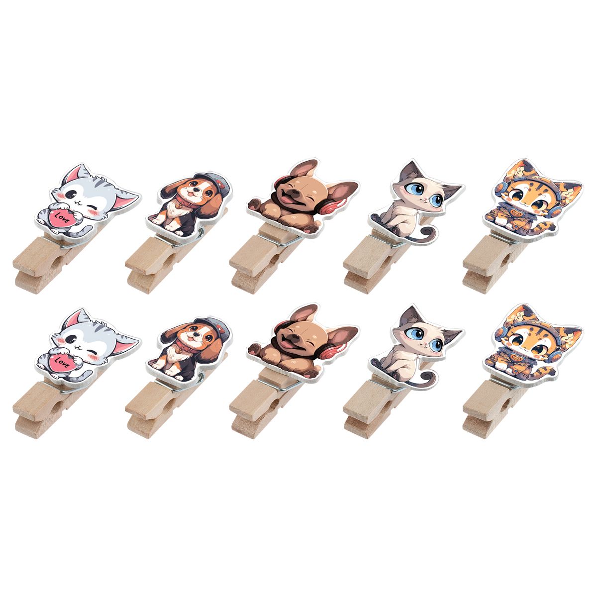 Зажимы для бумаг 7мм, MESHU "Cute pets", 10шт., деревянные, ассорти, опп пакет с европодвесом, веревка в комплекте