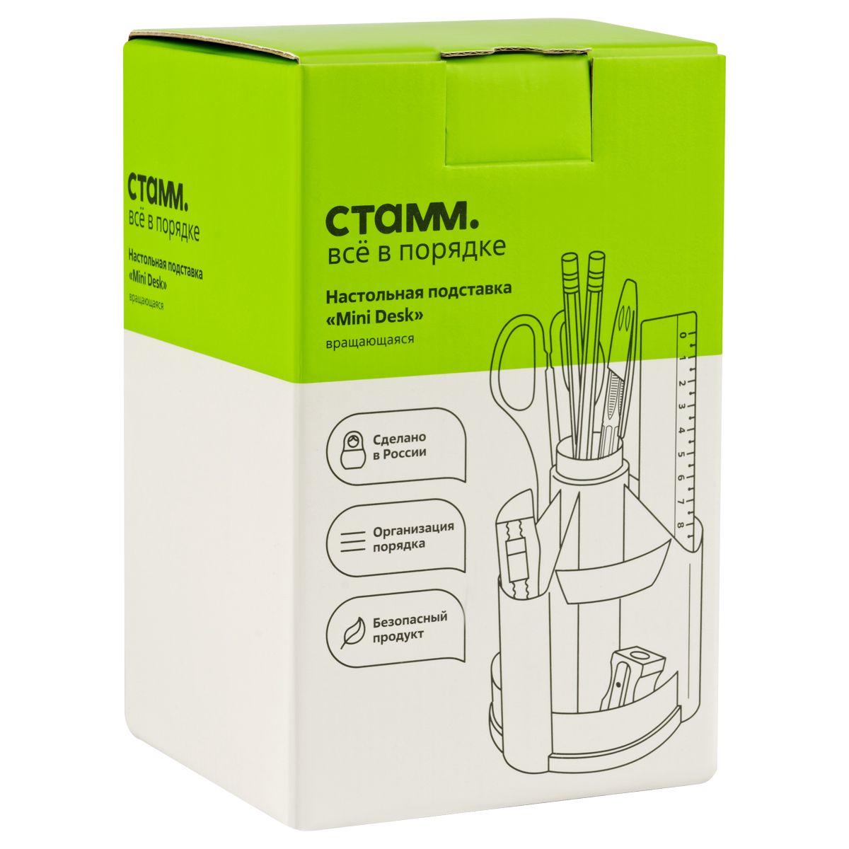 Органайзер и наполнение упакованы в картонную коробку. В состав набора входят: 2 шариковые ручки, 2 чернографитных карандаша, степлер для скоб №10, скобы №10, ножницы, канцелярский нож, точилка, ластик, линейка, скрепки 30 шт. и кнопки 10 шт.