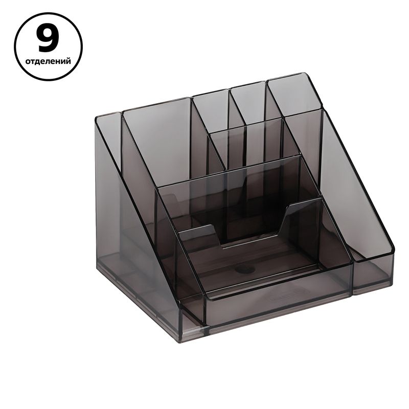 Прочный корпус, гладкая глянцевая поверхность. 9 отделений позволяют хранить множество канцелярских мелочей и пишущих принадлежностей. Высота подставки - 105 мм. Прочный корпус изделия изготовлен из полистирола.