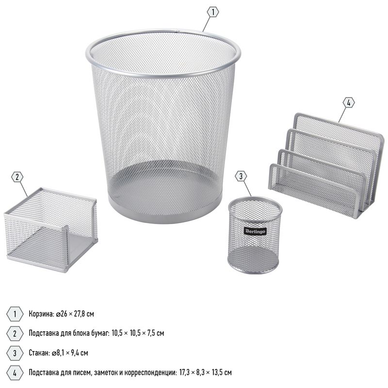 В набор входят: подставка-органайзер для пишущих принадлежностей (диаметр – 8,1*9,4 см), 3-х секционная подставка для бумаг и писем (17,3*8,3*13,5 см), подставка для бумажного блока (10,5*10,5*7,5 см), корзина для бумаг (объем – 14 литров).