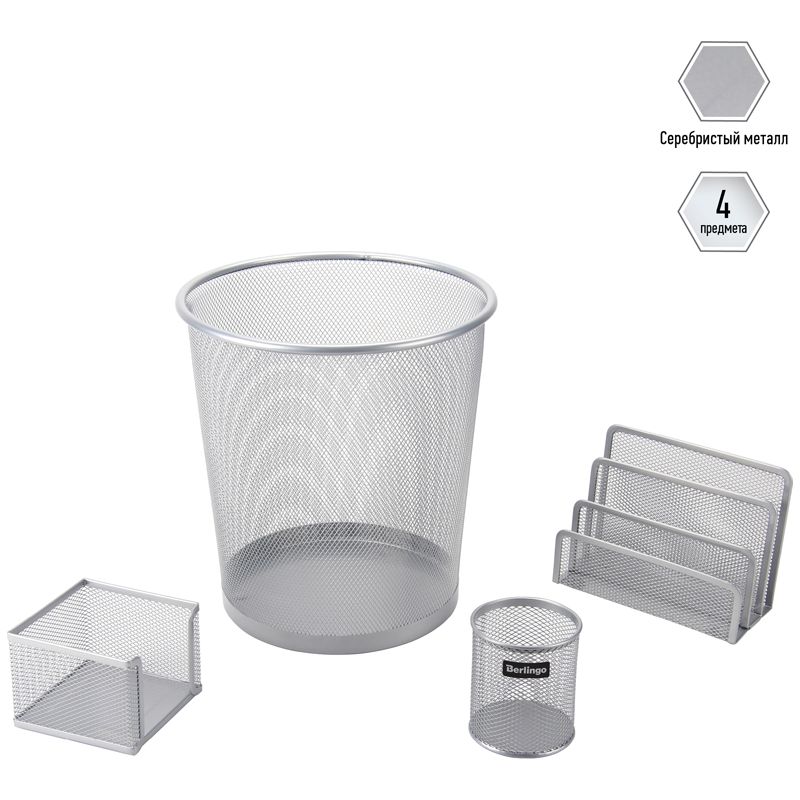 Настольный набор из металла Berlingo "Steel&Style", 4 предмета, с корзиной, серебристый