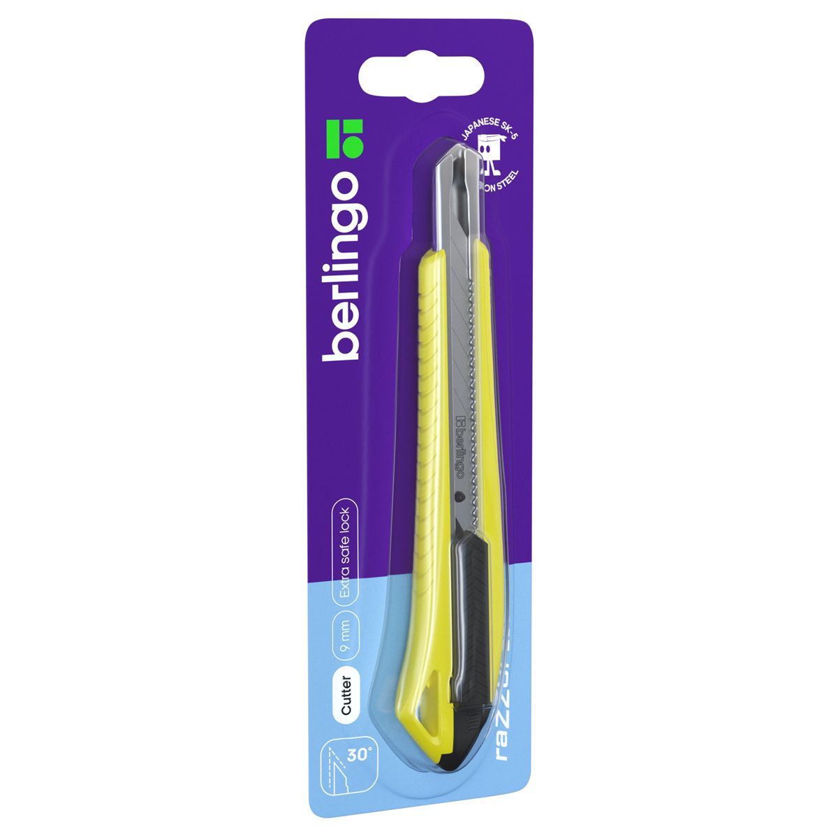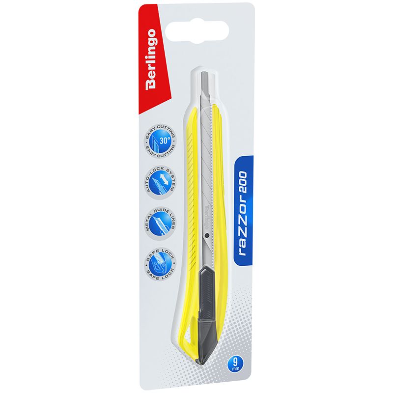 Нож канцелярский 9мм Berlingo "Razzor 200", auto-lock, металл. направл., желтый, европодвес