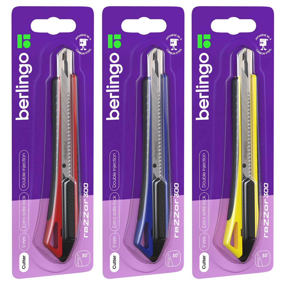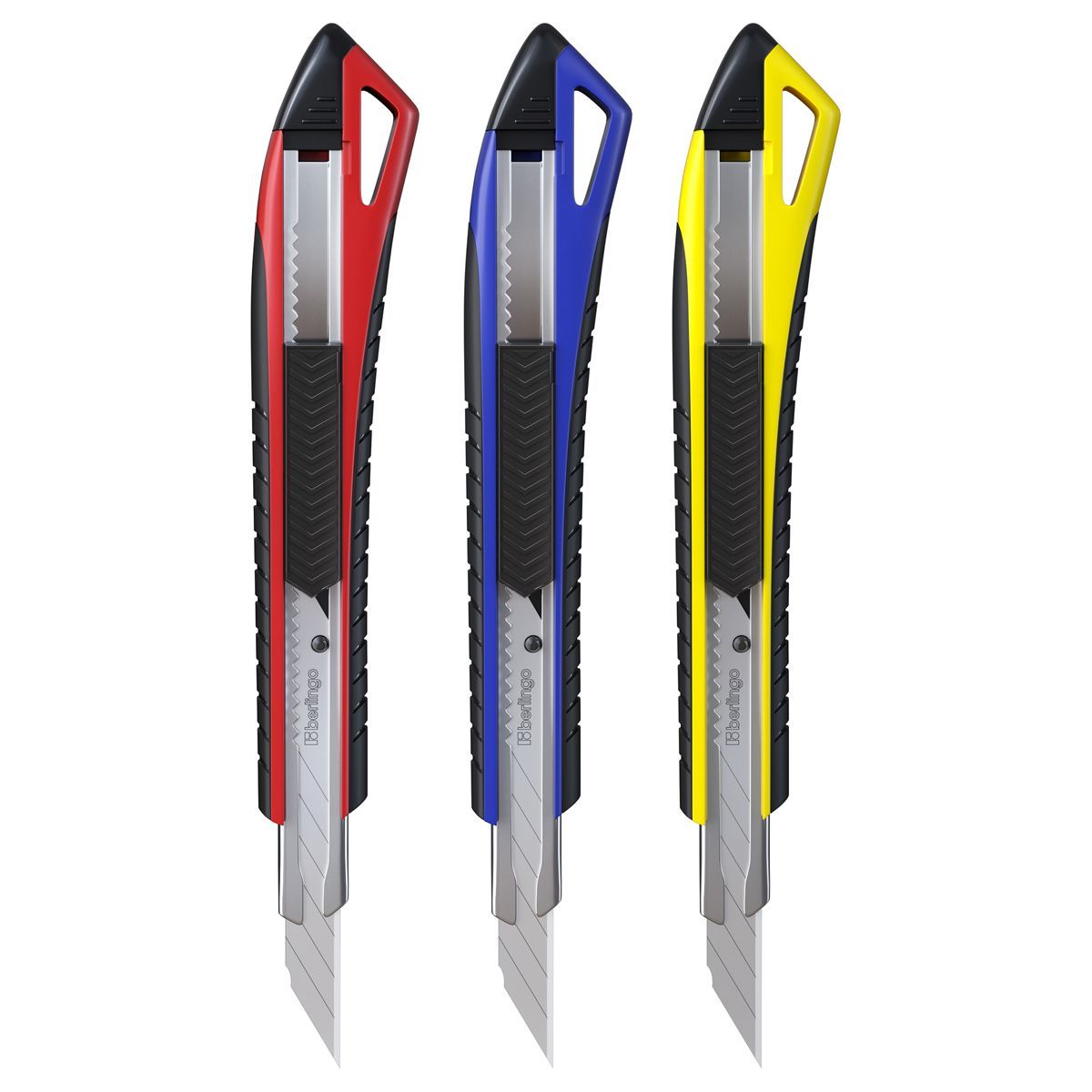 Нож канцелярский 9мм Berlingo "Razzor 300", auto-lock, металл. направл., мягкие вставки, ассорти, европодвес