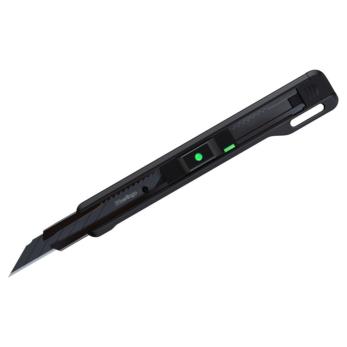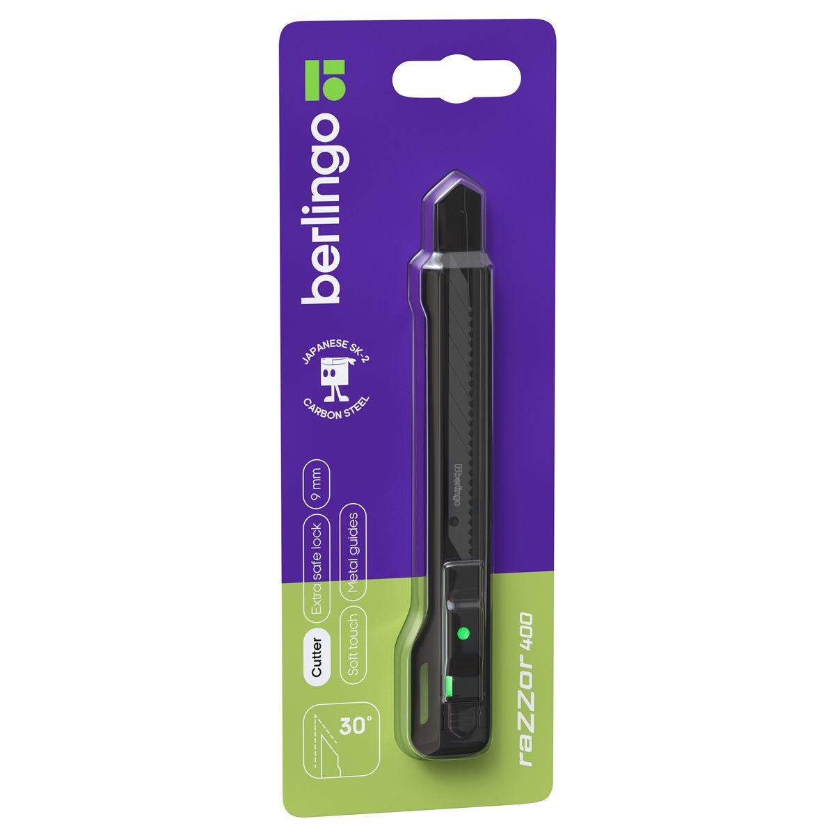 Нож канцелярский 9мм Berlingo "Razzor 400", черное лезвие, auto-lock, металл. направл., европодвес
