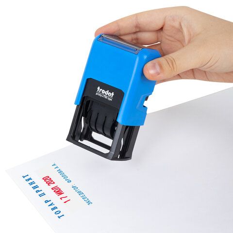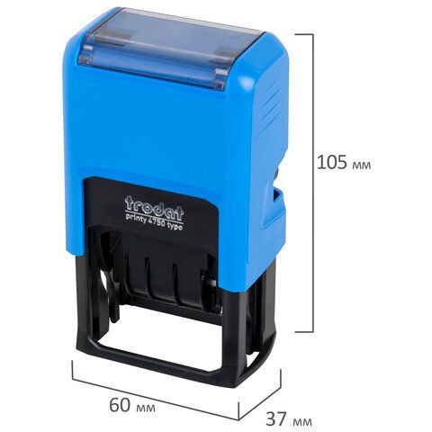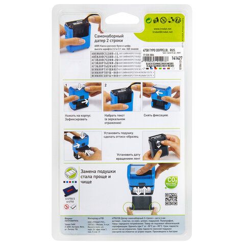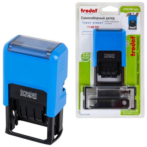 Самонаборный ленточный датер Trodat 4750 предназначен для проставления даты и произвольного текста в две строки. Оттиск размером 41×24 мм обеспечивает чёткое размещение информации на документах, при этом дата и текст выделяются синим и красным цветом для лучшей читаемости.
