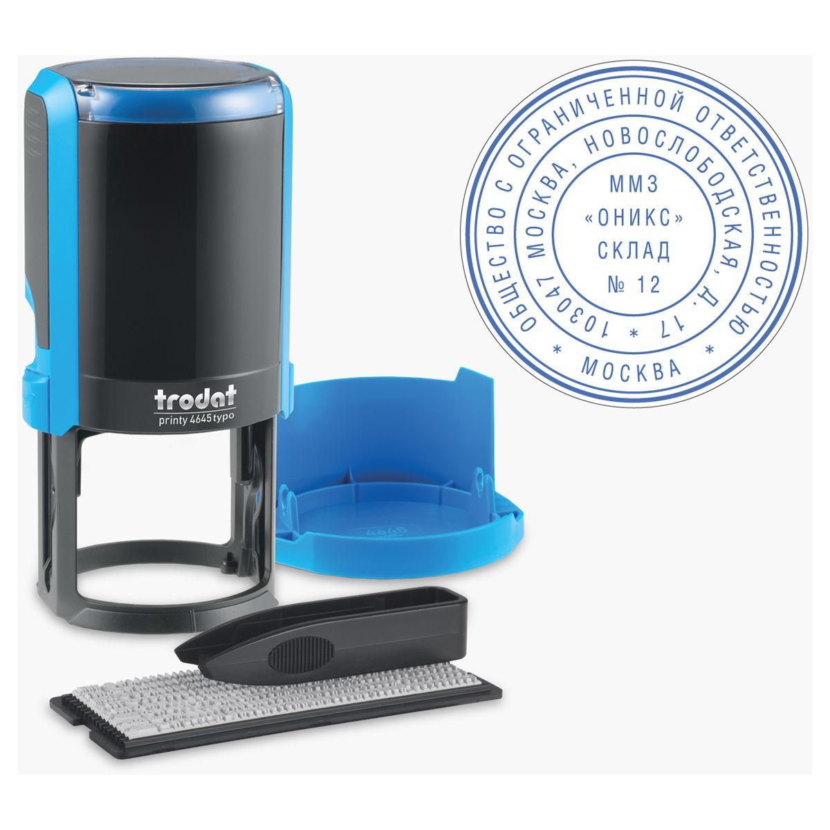 Самонаборные печати Trodat диаметром 45 мм обладают двумя круговыми рамками, что придаёт печати выразительность и ясность. Лёгкий пластиковый корпус обеспечивает удобство в использовании, а встроенный сменный картридж чернил(обычно синий) позволяет аккуратно и быстро поддерживать яркость оттисков. Самонаборный механизм гарантирует чёткость текста при каждом нажатии, сохраняет руки пользователя в чистоте и надёжен при регулярной работе.