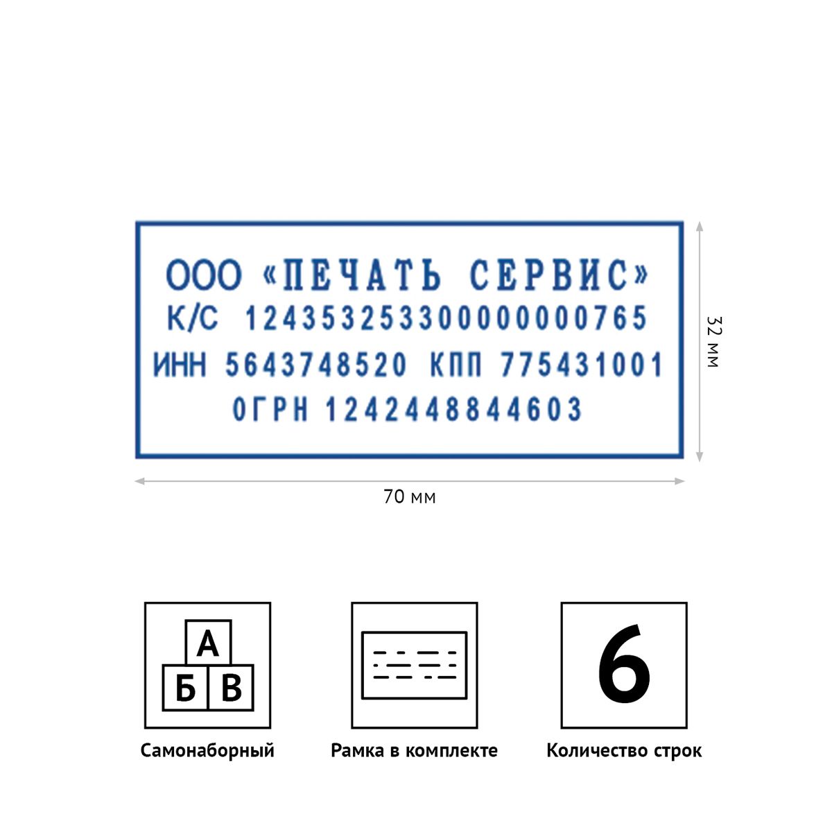 - Самонаборный штамп OfficeSpace, 6 строчек, оттиск 70×32 мм.