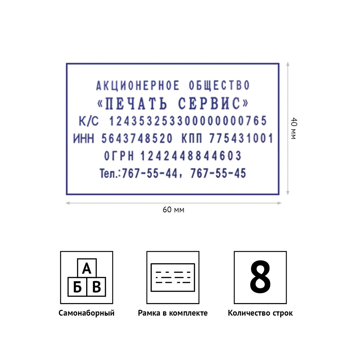 - Самонаборный штамп OfficeSpace, 8 строк / 6 со рамкой, поле 60×40 мм.