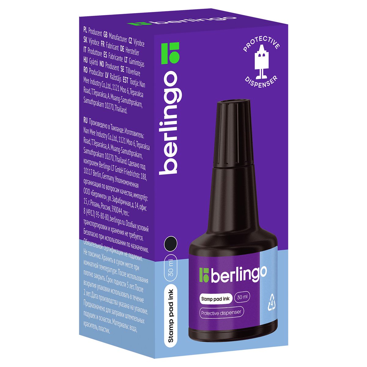 Штемпельная краска Berlingo — водная чёрная краска объёмом 30 мл для заправки штемпельных подушек. Краска представлена в стильном флаконе с дозатором-капельницей и надёжной индивидуальной упаковкой, что обеспечивает аккуратное использование и точное дозирование. Водно-основная формула гарантирует насыщенный и равномерный отпечаток, подходящий для большинства типов бумаги и картонных поверхностей.