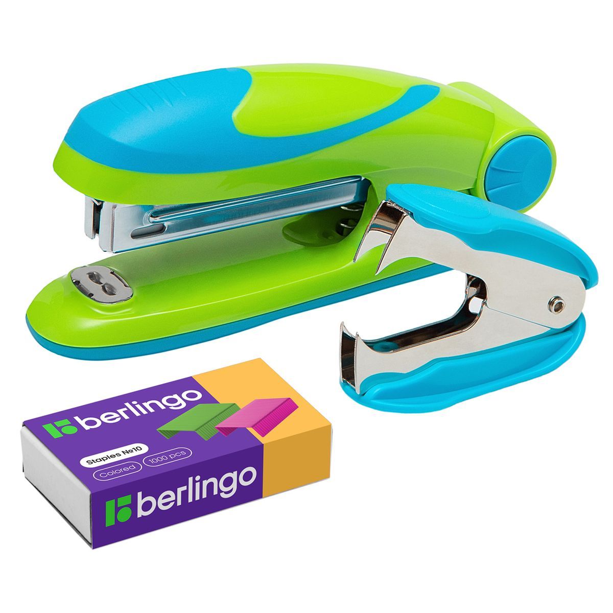 У модели пластиковый корпус с антискользящими резиновыми вставками и полностью металлический механизм. Корпус выполнен в ярком зелёном цвете с голубыми вставками. Антистеплер Berlingo с двухсторонним захватом предназначен для удаления скоб № 10, 24/6, 26/6 открытого и закрытого типа скрепления. Он имеет фиксатор, позволяющий хранить антистеплер в сложенном положении. Благодаря небольшому размеру легко поместится в настольном органайзере для письменных принадлежностей или школьном пенале. Также в комплекте 1000 цветных скоб № 10. Набор упакован в блистер.