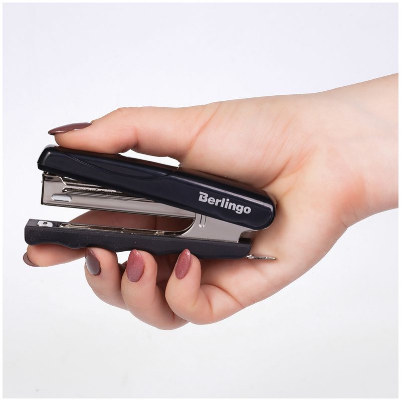 У данной модели пластиковый корпус и полностью металлический механизм. Мягкое эргономичное основание обеспечивает комфортную работу степлера даже на весу. Степлер оснащён встроенным антистеплером. Корпус выполнен в чёрном цвете. Упакован в картонный короб. Рекомендуется использовать со скобами Berlingo №10 или Berlingo Perfect.