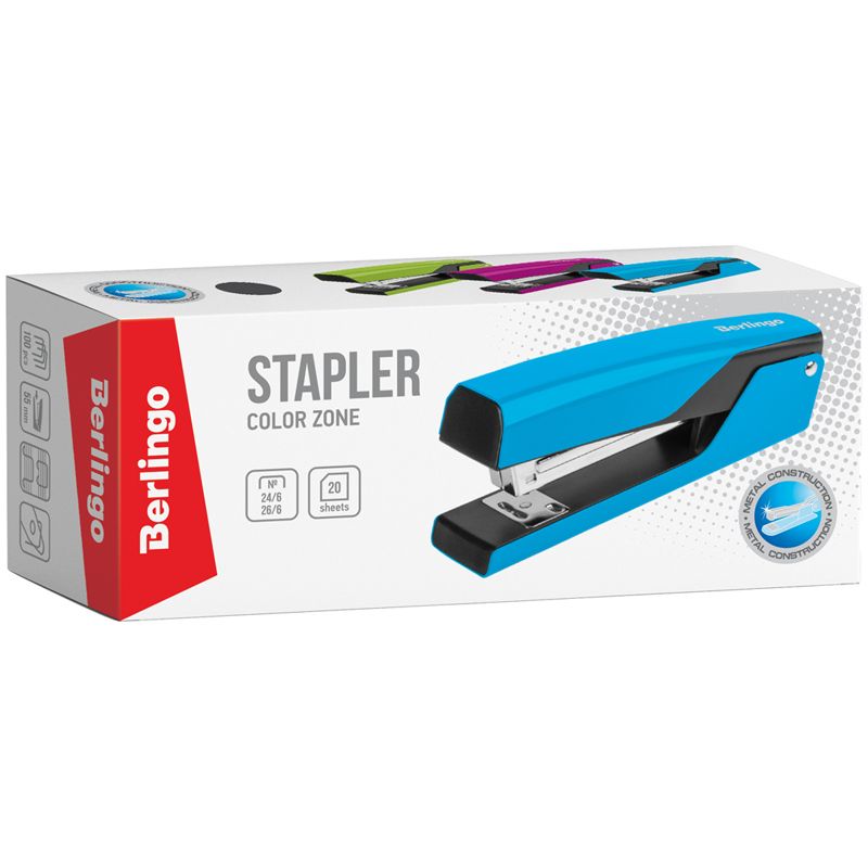 Степлер №24/6, 26/6 Berlingo "Color Zone" до 20л., металлический корпус, розовый