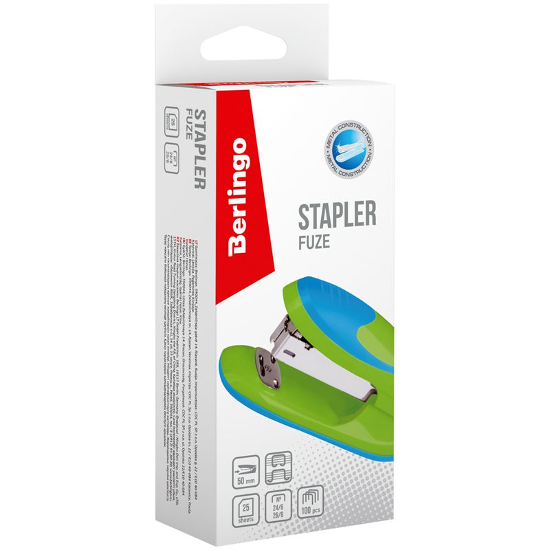 Степлер №24/6, 26/6 Berlingo "Fuze" до 25л., 100 скоб, пластиковый корпус, зеленый