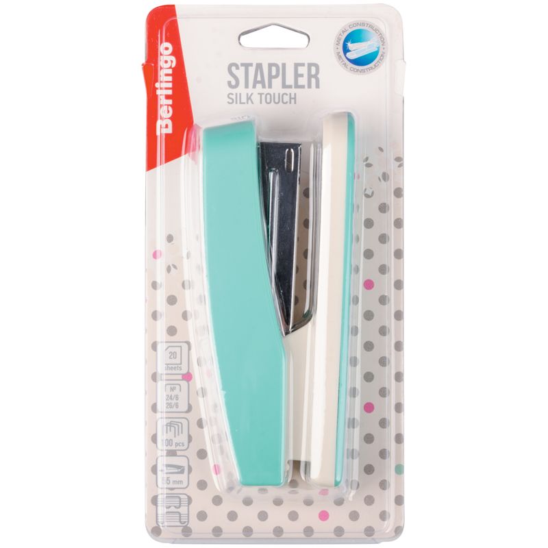 Степлер №24/6, 26/6 Berlingo "Silk Touch", до 20л., пластиковый корпус, мятный
