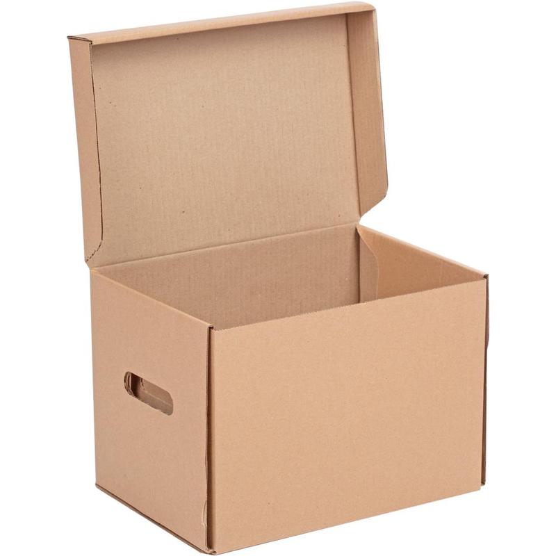 Он сделан из высококачественного бурого гофрокартона и способен выдерживать вес до 15–18 килограммов. У короба есть откидная крышка и отверстия по бокам для удобной переноски. Размер — 325*235*325 мм. Картон Т-23. Поставляется в разобранном виде и легко собирается без скотча и ножниц.