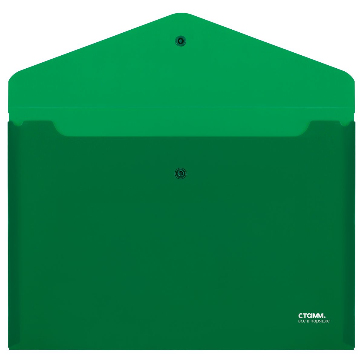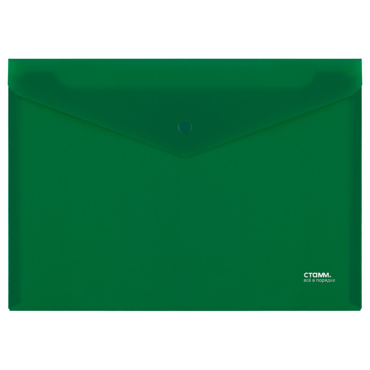 Папка-конверт на кнопке СТАММ А4, 180мкм, пластик, непрозрачная, зеленая