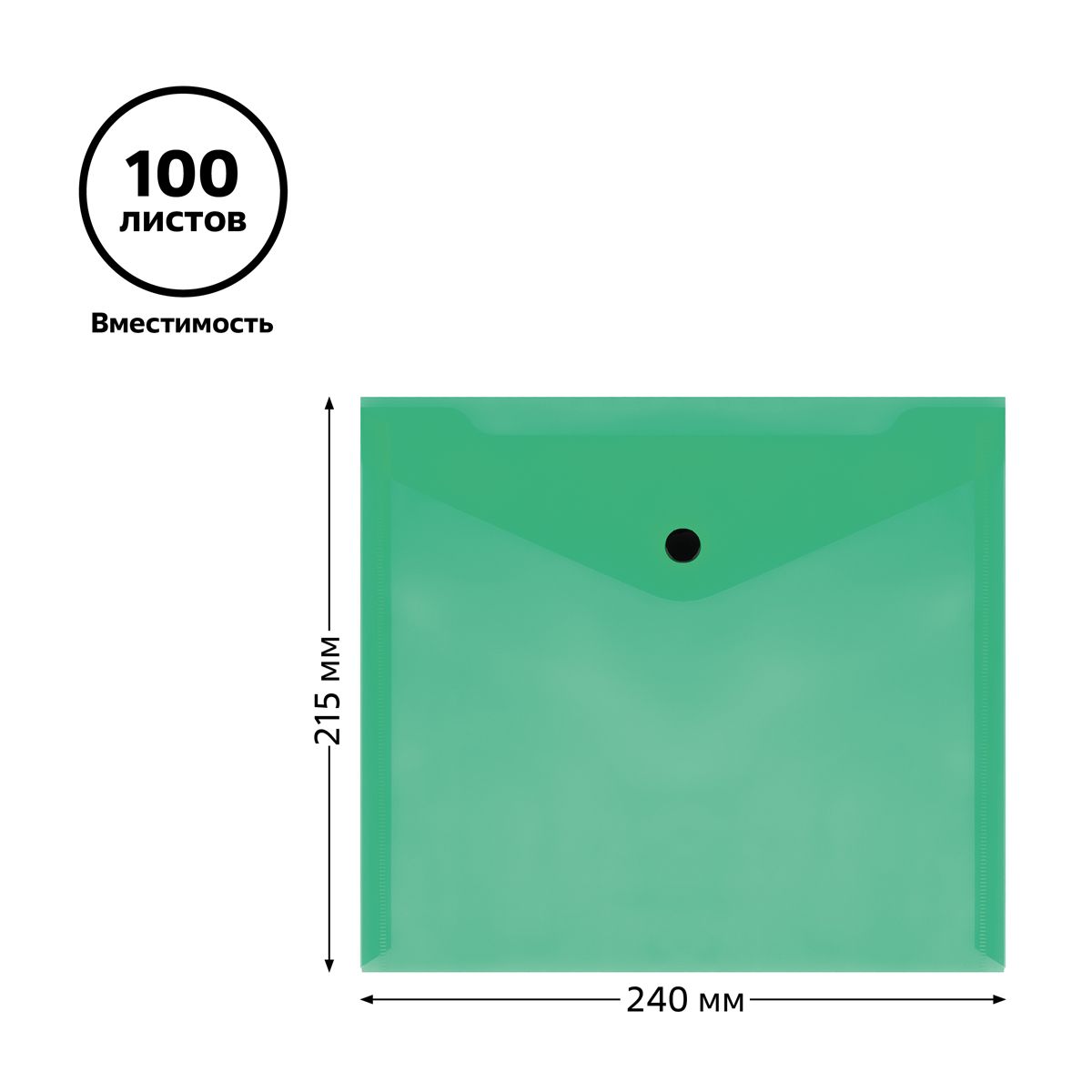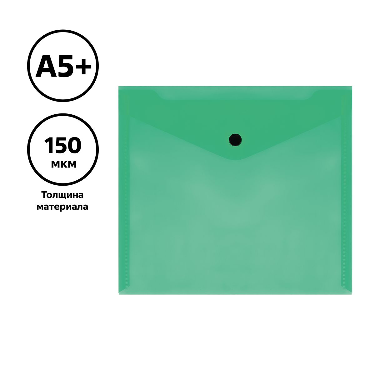 Папка-конверт на кнопке СТАММ А5+, 150мкм, пластик, прозрачная, зеленая