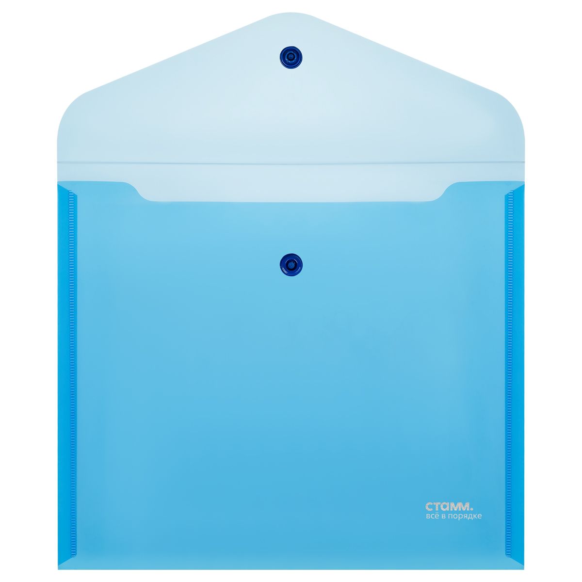 Папка-конверт на кнопке СТАММ А5+, 180мкм, пластик, прозрачная, синяя