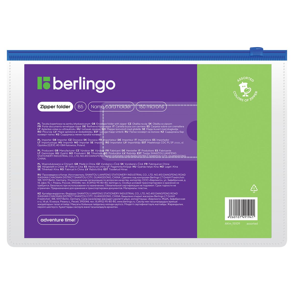 Папка-конверт на молнии Berlingo В5, 150мкм, с карманом для визиток, прозрачная, ассорти