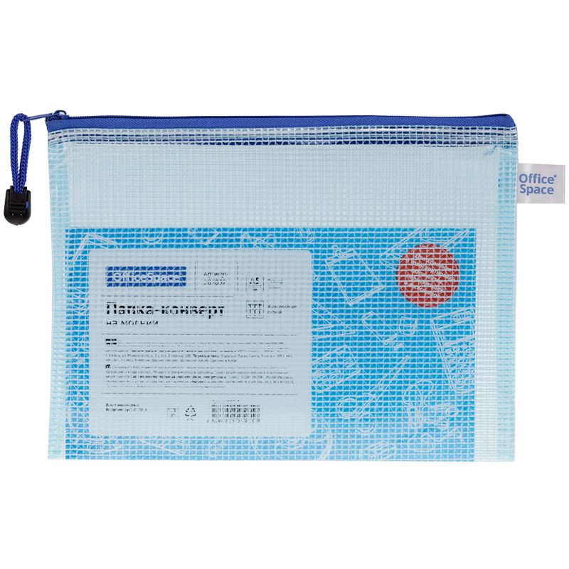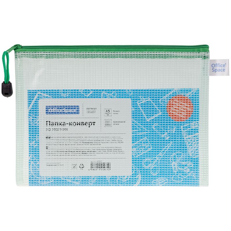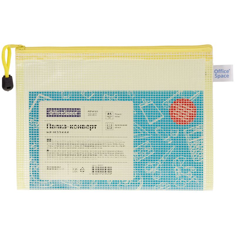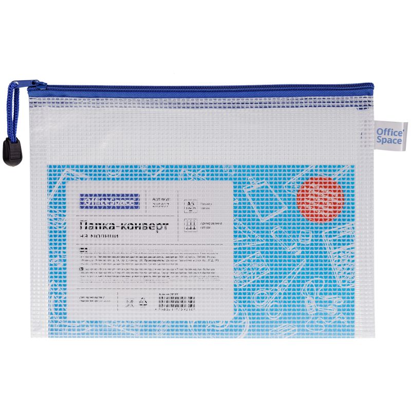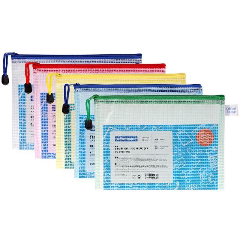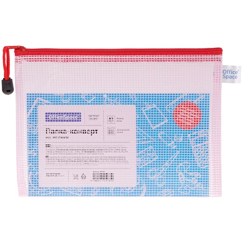 Папка-конверт на молнии OfficeSpace А5, ПВХ, 250мкм, сетка, прозрачная, молния сверху, ассорти