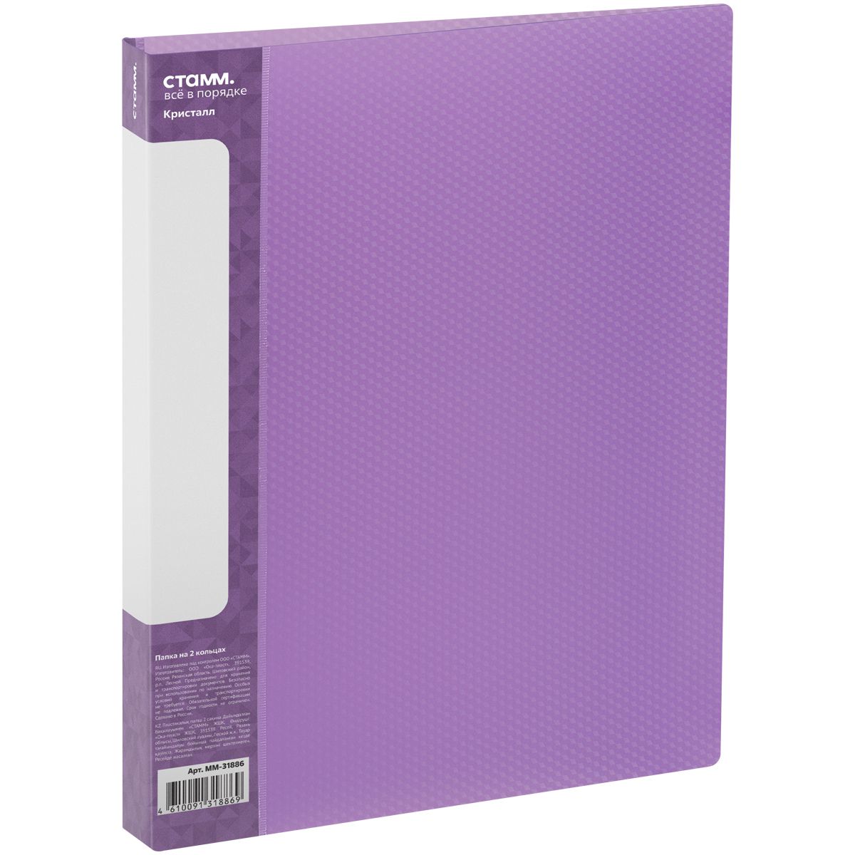 Папка на 2 кольцах СТАММ "Кристалл" А4, 40мм, 700мкм, пластик, фиолетовая