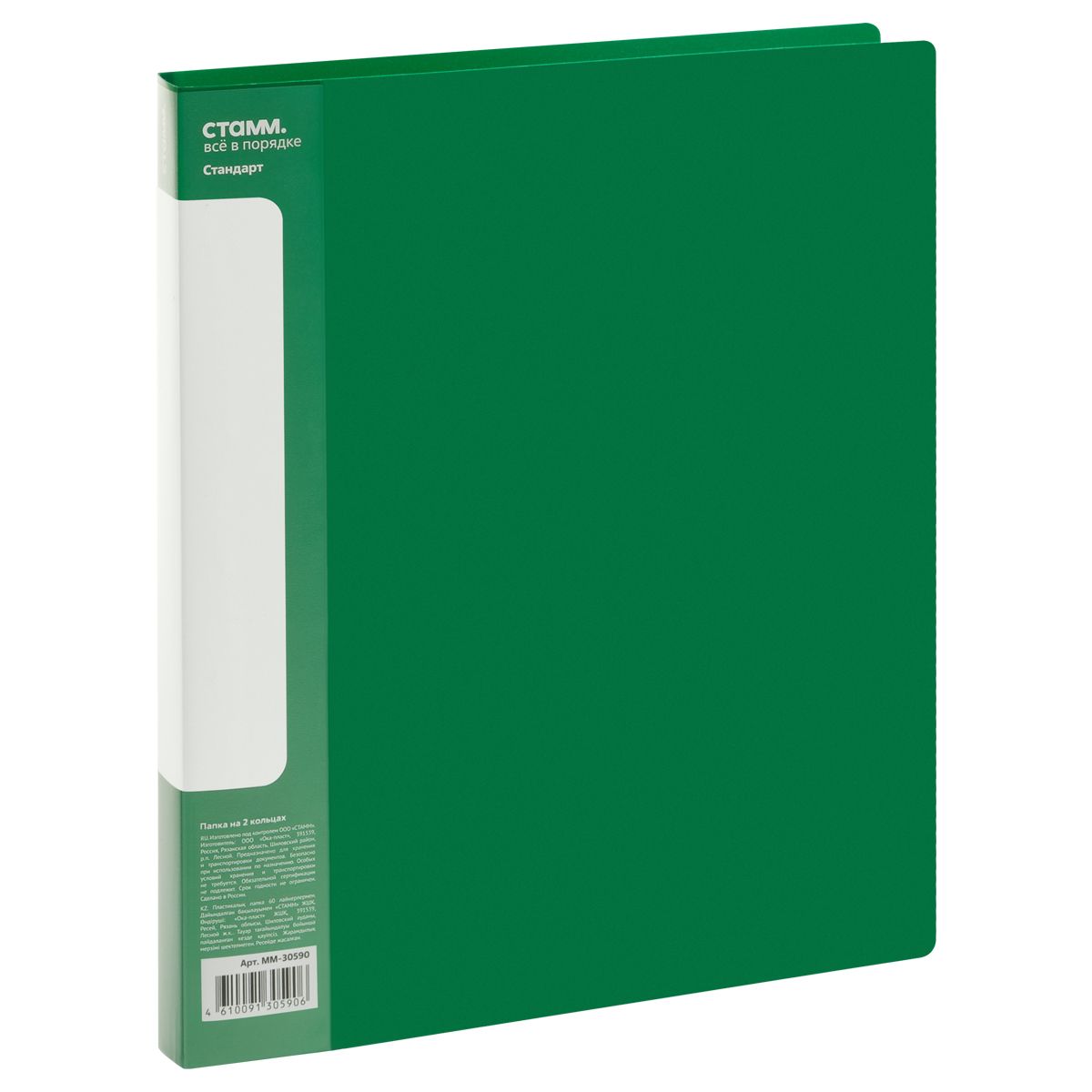 Папка на 2 кольцах СТАММ "Стандарт" А4, 25мм, 700мкм, пластик, зеленая